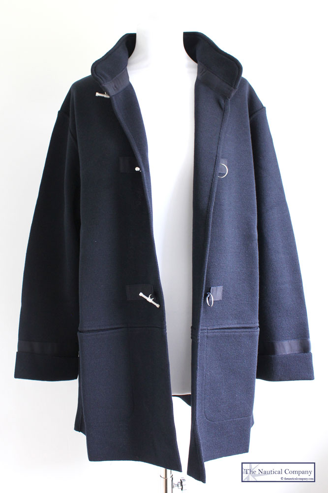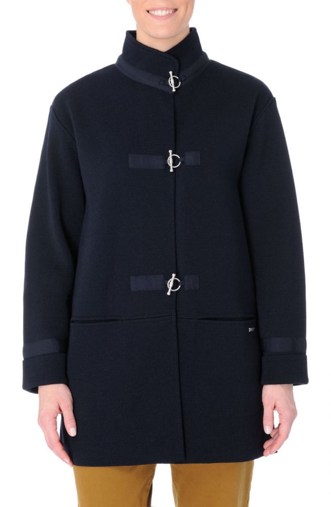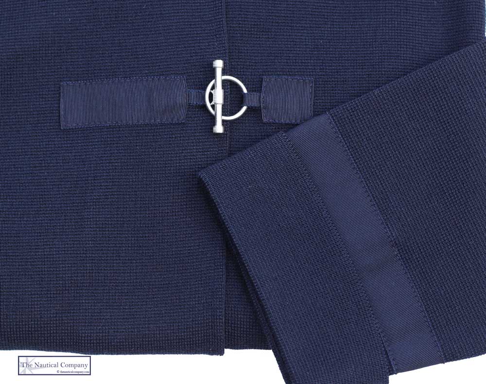 This beautifully crafted navy blue knit jacket by French nautical label Royal Mer Bretagne is not a best seller for nothing. Made in France in a dark navy rich merino wool roma stitch with a high collar, long sleeves, two front flat seam pockets, finished with a grosgrain fabric around the fastening and cuffs, one small metal signature plate and closed by three steel metal toggle clasps.