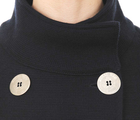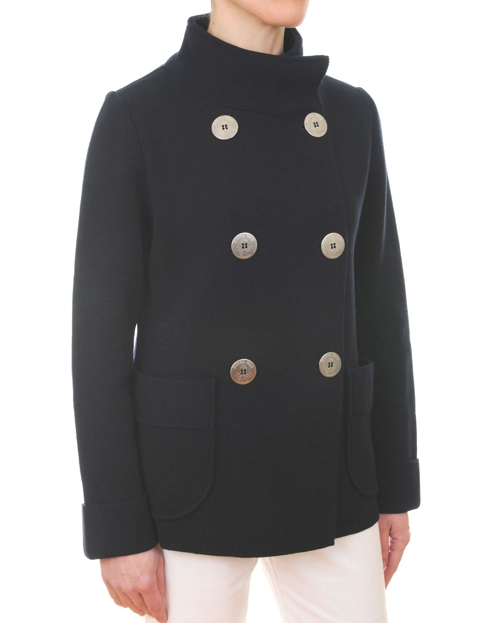 A stunning nautical peacoat style jacket from French renowned marine label, Royal Mer Bretagne, in dark navy blue. A beautiful Roma stitch knit, double breasted with eight signature branding metallic flat buttons with an anchor engraved, high neck, two sheath pockets, long sleeves with cuffs and a small metal plate with Royal Mer name on upper middle back.