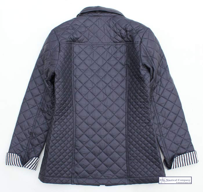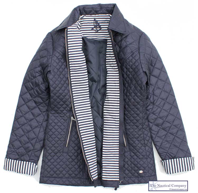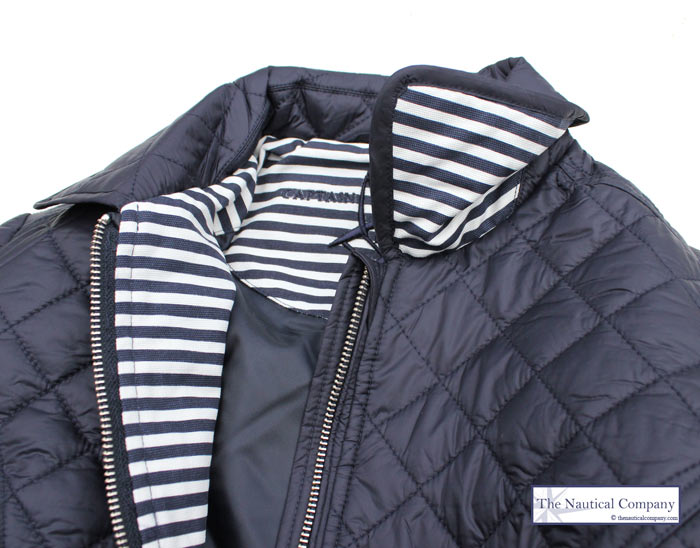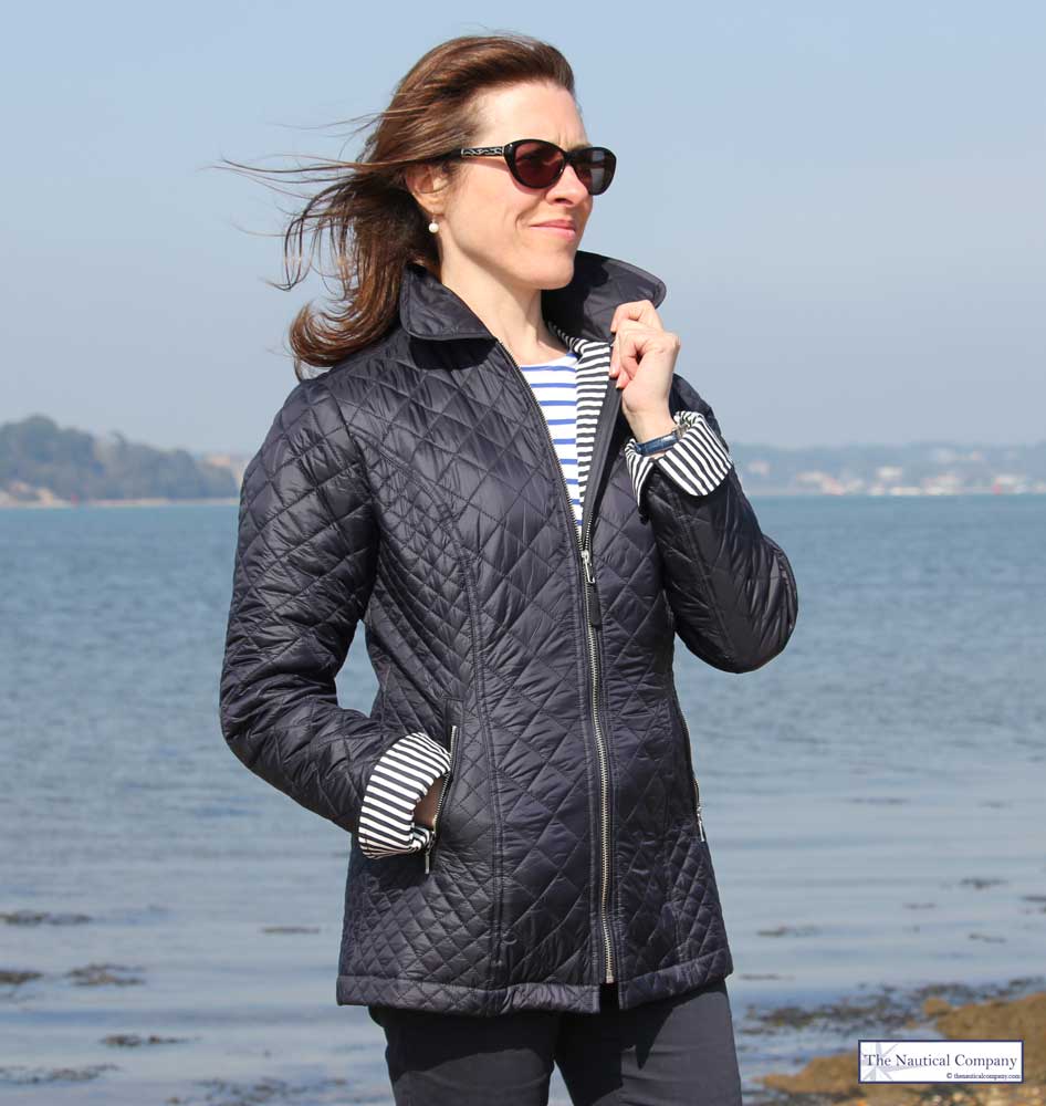 Chic ladies' navy blue quilted jacket for the spring/summer season. Crafted in a lozenge shape lightweight quilt fabric with a white and navy blue striped fabric under the rounded collar, optional turn-over rounded cuffs and two large internal bands on other side of the front zip. Beautifully designed jacket, so light and easy to wear when the summer breeze picks up. Fully lined including a full body front zip, two front zip pockets and one internal one, small label engraved metal plate on front hem. The stripy fabric is just enough to give it a nautical feel without going overboard.