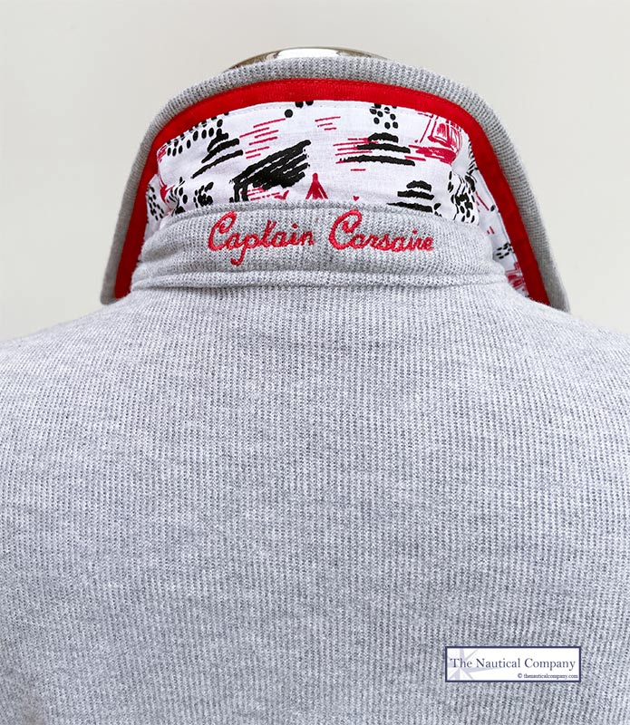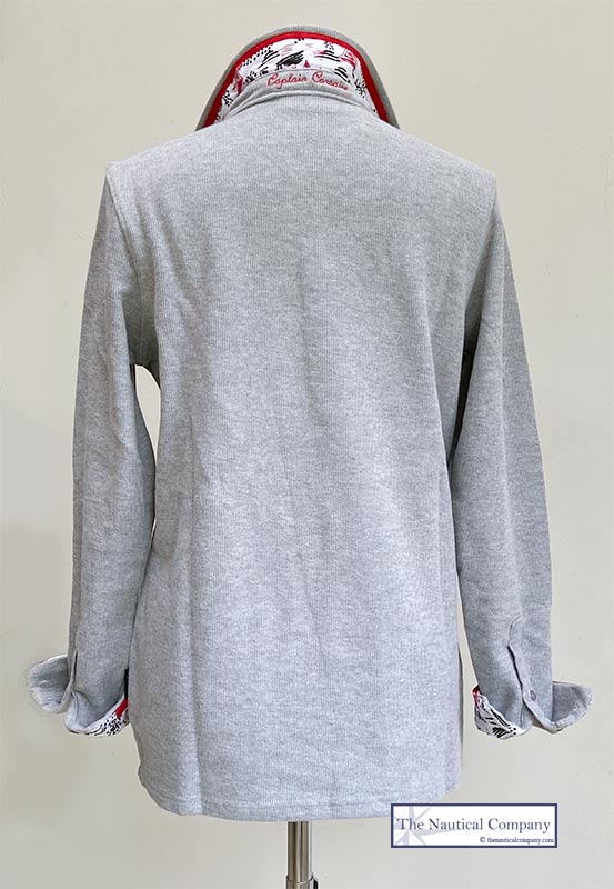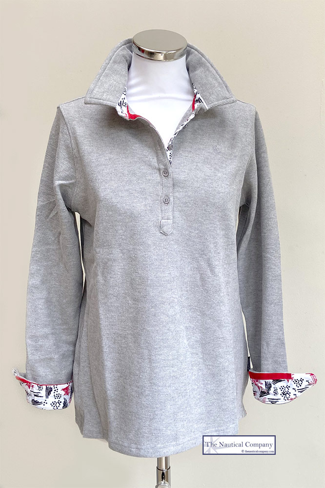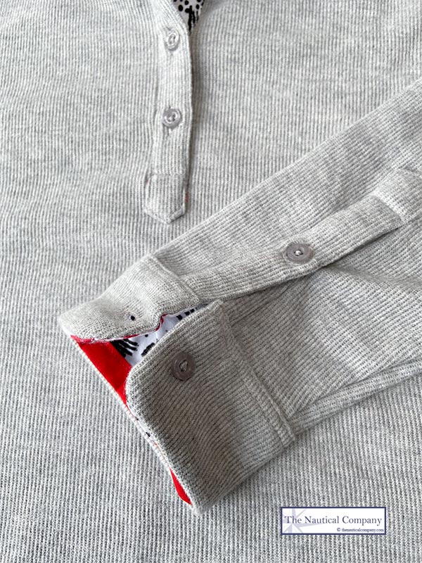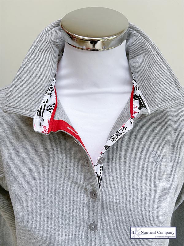 Nice classic long sleeved polo shirt for women in light grey, designed in plain rib quality thick cotton. We love the nautical finishing touches with the boats print and red fabric under collar, around the neckline, under the placket and inside buttoned cuffs. Embroidered brand logo in the shape of a small catamaran boat on bust, side slits.