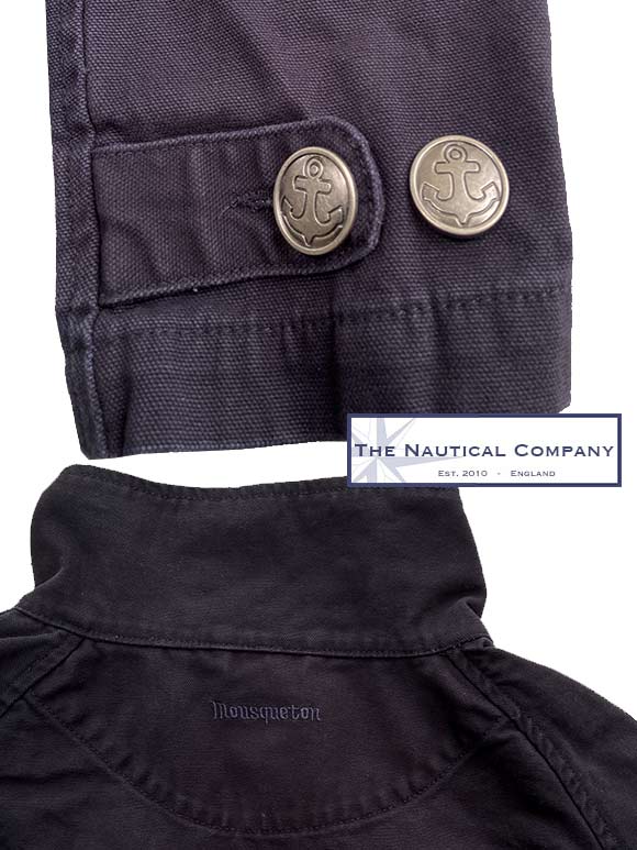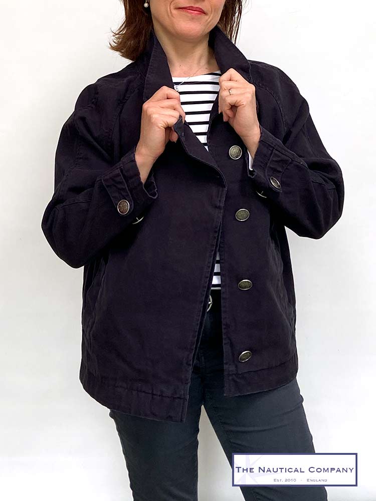 Beautiful short canvas jacket for ladies in navy blue by French label Mousqueton. Heavyweight cotton, raglan sleeves, asymmetric front opening with lovely anchor engraved metal buttons, two front pockets with the brand small logo embroidered on one, adjustable tabs on cuffs. Collar can be worn opened flat or straight up thanks to a tab attaching to a button, brand name embroidered on the back. The design of the Quimperle jacket is relax with a slight bomber volume effect with small pleats at the back.