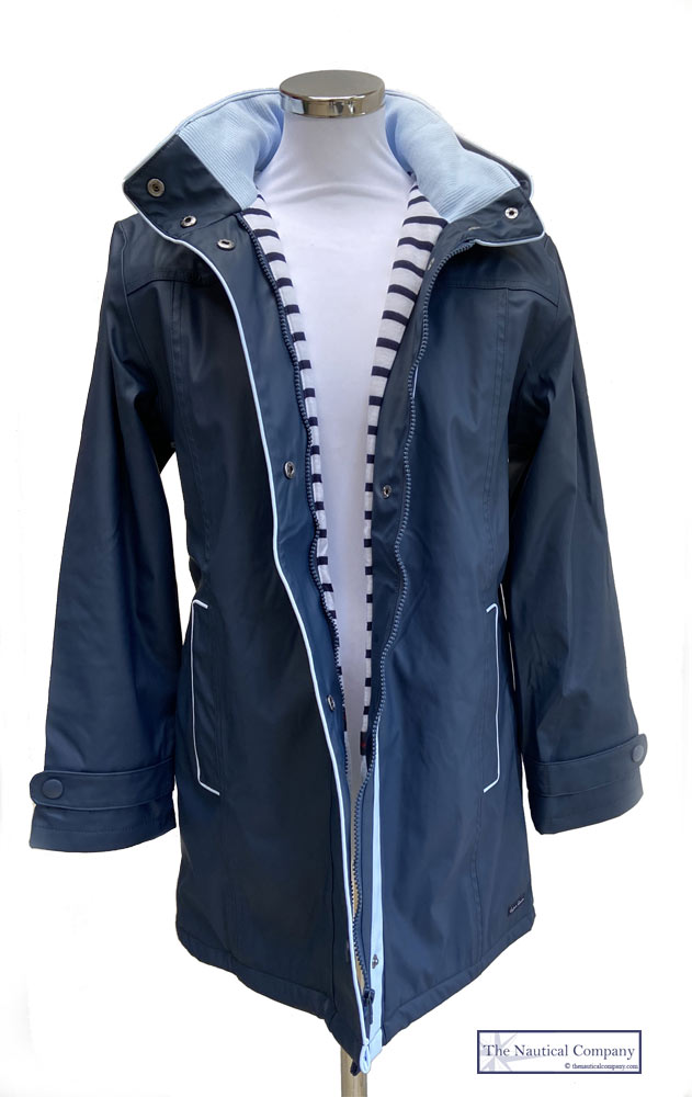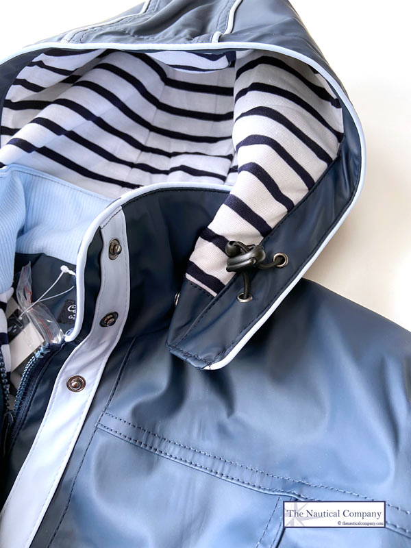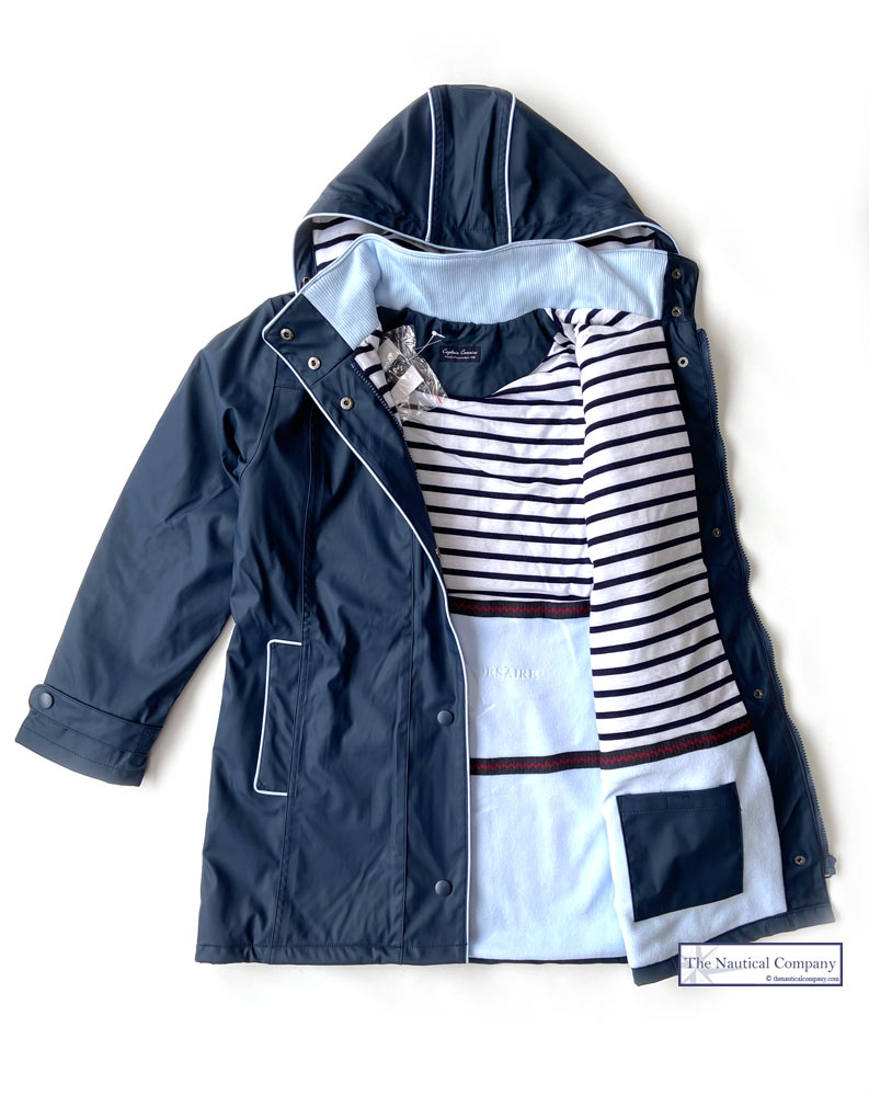 This is the winter version of our popular striped lined women's navy blue raincoat. Fully lined hooded raincoat for women in matt navy blue. Made of a soft 100% polyurethane, this waterproof jacket, designed in France by Captain Corsaire, is well finished with taped seams, including a full body front zip and popper buttons, a ribbed cotton light blue collar, two front pockets, internal elasticated cuffs, popper buttons on cuffs, one internal pocket, small label sewn on bottom front of the jacket, detachable hood via popper buttons.