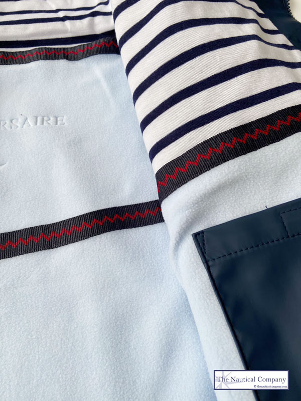 The upper body is lined with a warm soft striped white/navy blue fabric and the lower part with a light blue fleece. The hood also lined with the same warm striped fabric.